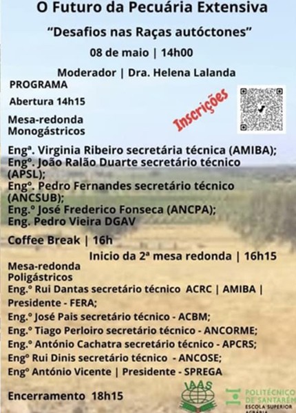 O comité de Santarém da Associação Internacional de Estudantes de Agricultura (IAAS) organiza a mesa redonda “O Futuro da pecuária extensiva: Desafios nas raças autóctones”, que decorrerá no dia 8 de Maio, pelas 14 horas, na Escola Superior Agrária de Santarém.