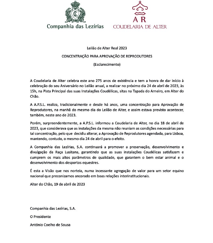 Todos sabemos que as mudanças geram desconfortos, podendo por vezes até dificultar o planeamento atempado de qualquer evento. Assim recebemos uma nota de esclarecimento da Companhia das Lezírias sobre a mudança de local da Concentração para Aprovação de Reprodutores, agendada para 24 de Abril que damos a conhecer: