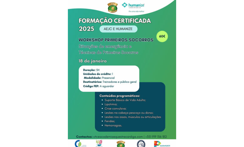 A 18 de Janeiro realiza-se a primeira formação do ano, com uma parceria entre o CTC e a HUMANIZE. Um WORKSHOP sobre “SITUAÇÕES DE EMERGENCIA E TÉCNICAS DE PRIMEIROS SOCORROS” (ver cartaz em anexo)