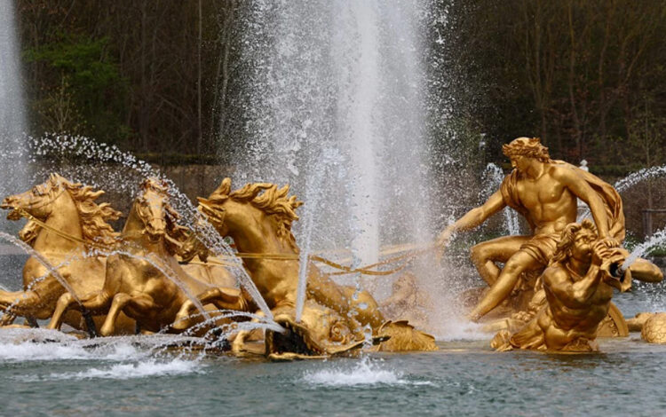 Esta estátua de Jean-Baptiste Tuby representa o deus Apolo numa carruagem puxada por quatro cavalos, cercada por outra divindade, Fáeton, tritões e golfinhos.
