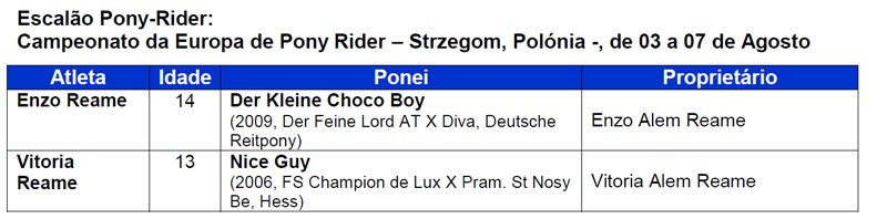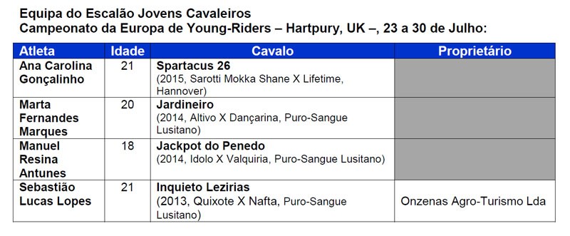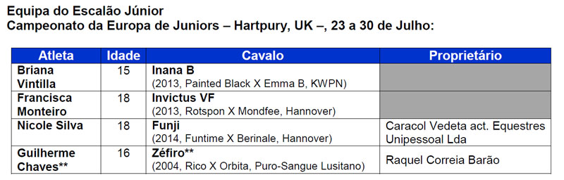 A FEP através do seu comunicado de 21 de Junho, e após os resultados desportivos alcançados e da monitorização das performances dos Atletas dos escalões da juventude informa os conjuntos selecionados que vão representar Portugal nos Campeonatos da Europa de Dressage a decorrer na Polónia e na Grã Bretanha: