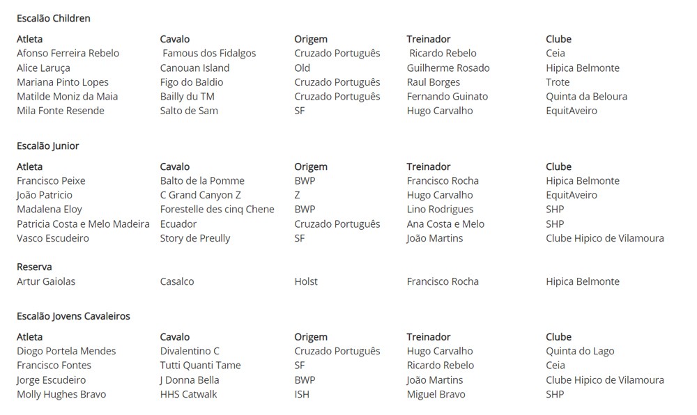 A Equipa de Saltos de Obstáculos da Federação Equestre Portuguesa, confirmou esta terça-feira, os conjuntos pré-seleccionados para o Campeonato da Europa da Juventude a realizar em Vilamoura entre 18 e 25 de Julho, como sendo: