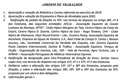 De salientar que o facto do ponto 1 – Apreciação e votação do Relatório e Contas referente ao exercício de 2019, não ter sido aprovado, o Presidente da FEP alertou para o facto de que esta situação implica uma gestão financeira por duodécimos, assim como a perda de apoios e fundos monetários, com graves prejuízos para a FEP.