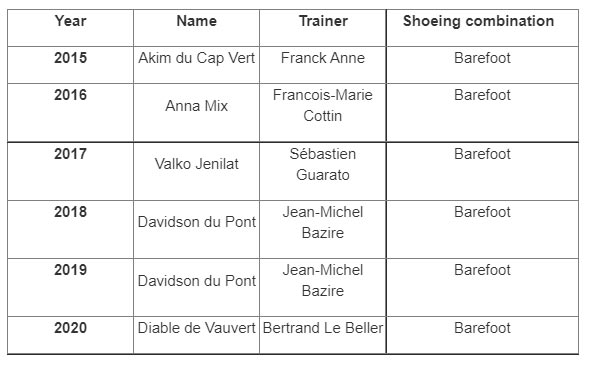 É interessante registar que os últimos seis vencedores tenham corrido sem ferraduras.