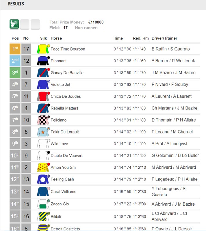 O diver Eric Raffin com «Face Time Bourbon» começou a prova de forma discreta, mas rapidamente assumiu a liderança e manteve-se na pole position. O driver esperou pela última curva para acelarar deixando o segundo lugar para Anthony Barrier e Etonnant. O driver francês Jean-Michel Brazire com Ganay de Banville foi terceiro classificado.
