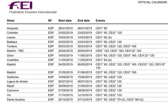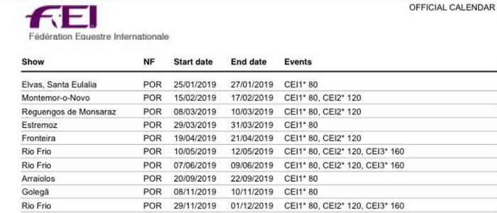 Segundo a FEI estas são as Provas Internacionais que vão decorrer em Portugal e Espanha durante o ano de 2019.