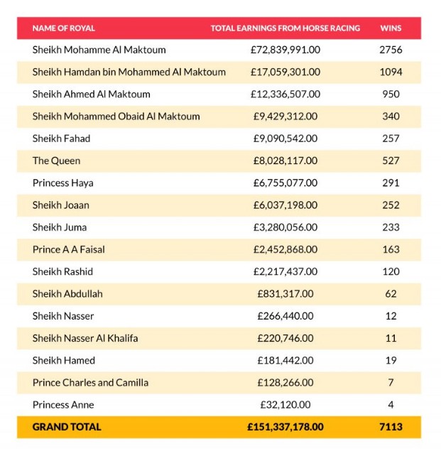 O Sheikh Mohammed Al Maktoum tem tirado o máximo proveito das corridas de cavalos até hoje, com mais de 72 milhões de libras (€83.909.087) arrecadadas em prémios monetários, como mostra a tabela abaixo: