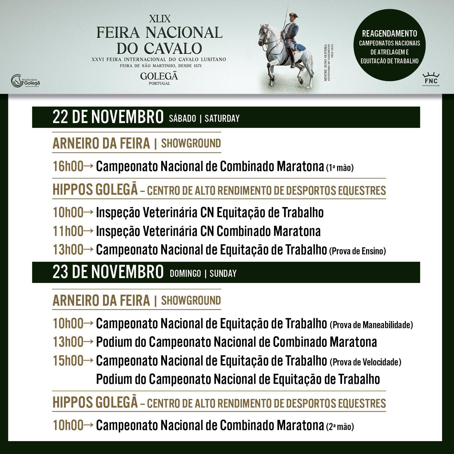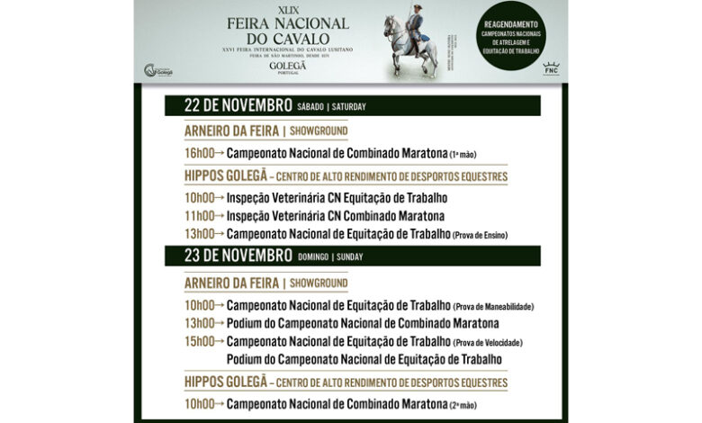 Apresentamos abaixo o novo programa oficial para os dias 22 e 23 de novembro, com os horários devidamente ajustados para o Arneiro da Feira e para o Hippos Golegã – Centro de Alto Rendimento de Desportos Equestres.