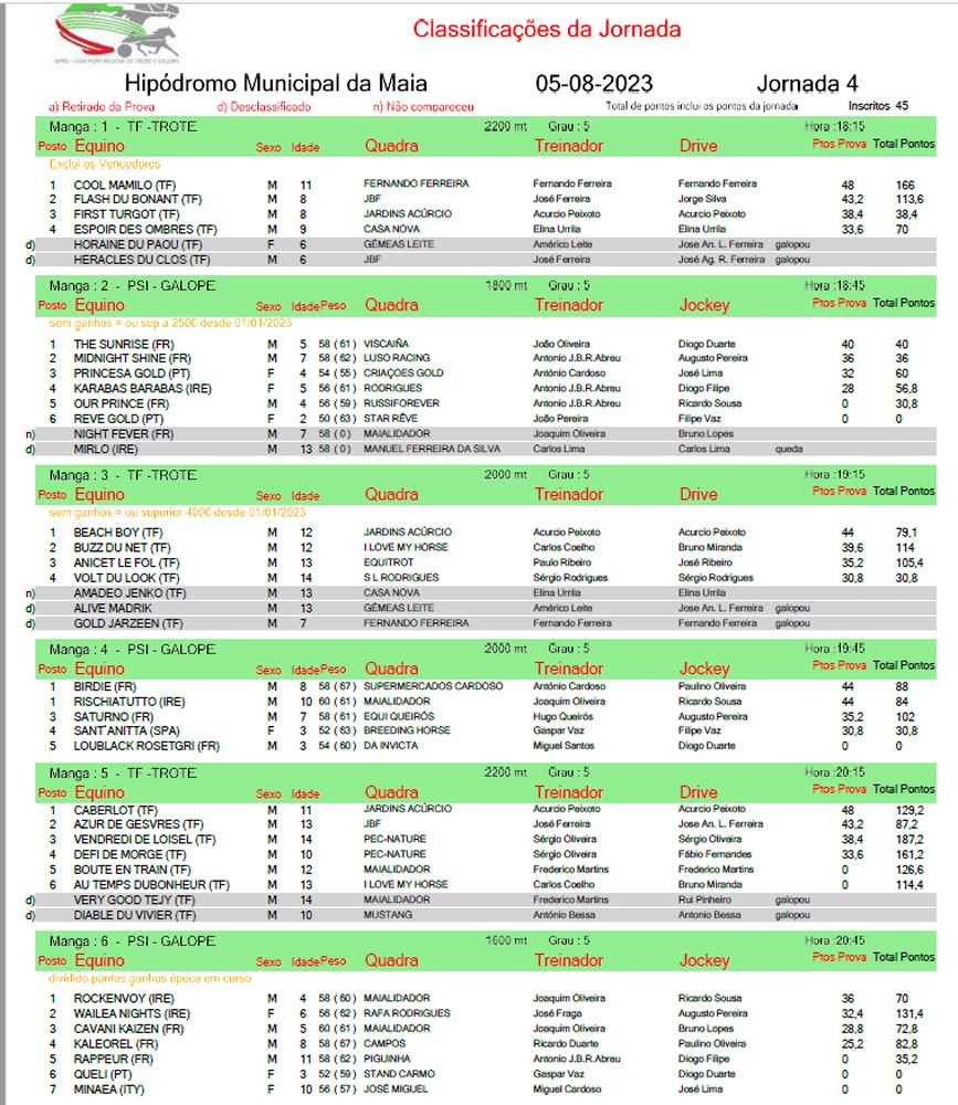 No passado sábado, dia 5 de Agôsto, decorreu, no Hipódromo Municipal da Maia, a 4ª Jornada do Campeonato Nacional Campeonato Nacional de Corridas de Trote e Galope