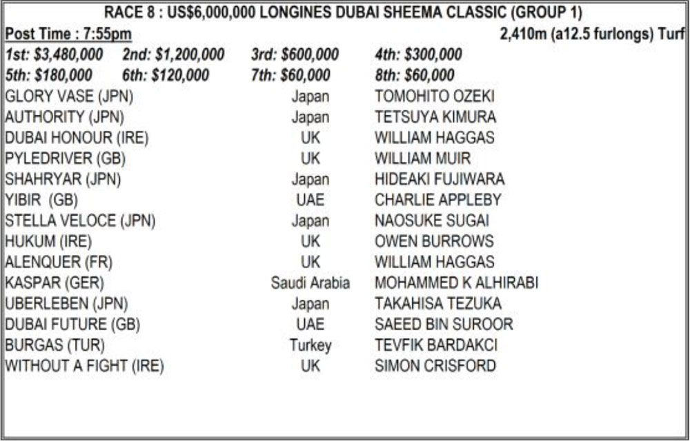 Esta segunda prova mais importante do Dubai World Cup contempla um prize money de 6 milhões de dólares, dos quais $3.400.000 são para o vencedor.