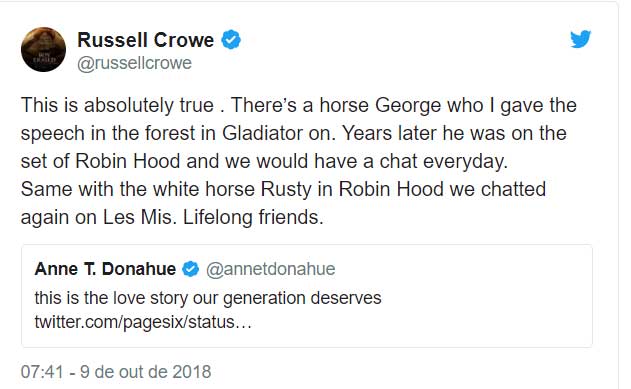 “É absolutamente verdade. Há um cavalo chamado George que contracenou comigo no filme Gladiador. Anos depois encontrei-o no set de Robin Hood. O mesmo aconteceu com o cavalo Rusty, no filme Robin Hood, voltámos a contracenar em Os Miseráveis (2012). Ficámos amigos para sempre” escreveu o actor na rede social.