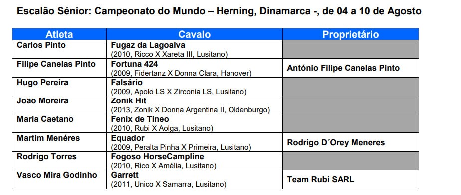 A FEP deu a conhecer através de um comunicado desta quarta-feira, os 8 conjuntos que foram pré-selecionados para o Campeonato do Mundo de Dressage que terá lugar em Herning – Dinamarca, de 04 a 10 de Agosto.