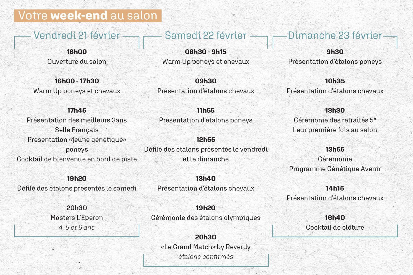 A abertura dos portões acontecerá na sexta-feira, 21 de fevereiro, às 16h. Neste primeiro dia, o foco será a genética de cavalos e póneis, permitindo que os criadores descubram as futuras estrelas. À noite, os visitantes terão a oportunidade de assistir à prestigiada noite Masters l’Éperon, uma prova reservada a cavalos de 4, 5 e 6 anos.