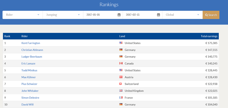 Kent Farrington é o cavaleiro que até ao momento tem conquistado o maior prize money € 175.385 em 2017. Segue-se o alemão Christian Ahlmann com € 147.000 enquanto o seu compatriota Ludger Beerbaum ocupa o terceiro lugar com €141.000. Eric Lamaze em quarto lugar com €140.000 e Todd Minikus em quinto com €128.000.