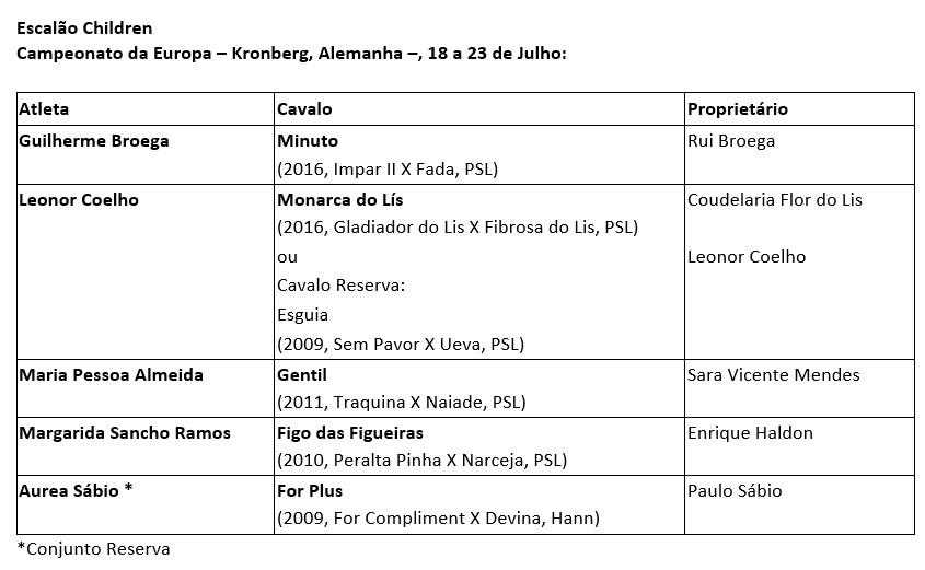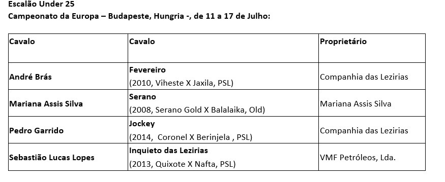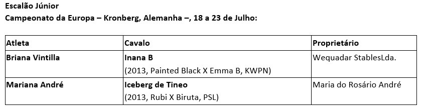 A Federação Equestre Portuguesa informa que na sequência do trabalho desenvolvido, dos resultados desportivos e da constante monitorização das performances dos Atletas dos escalões da juventude abaixo indicados, é com muito prazer que comunica a lista dos respetivos Conjuntos selecionados para representar Portugal nos Campeonatos da Europa de Dressage, aos quais endereça desde já votos de muito sucesso: