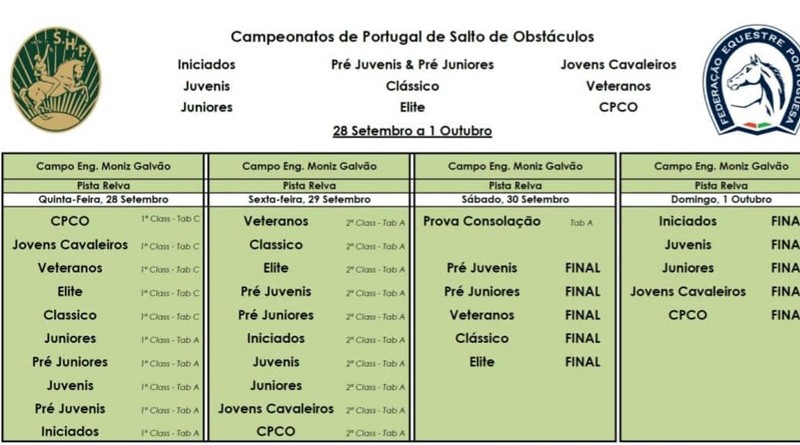 Estes Campeonatos terão lugar entre 28 de Setembro e 1 de Outubro nas instalações da Sociedade Hípica Portuguesa em Lisboa.