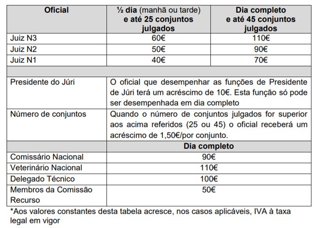 Fica estabelecido para todas as Competições de Dressage, como remuneração miníma diária de referência, a liquidar pelas Comissões Organizadoras aos Oficiais de Competição, os seguintes valores: