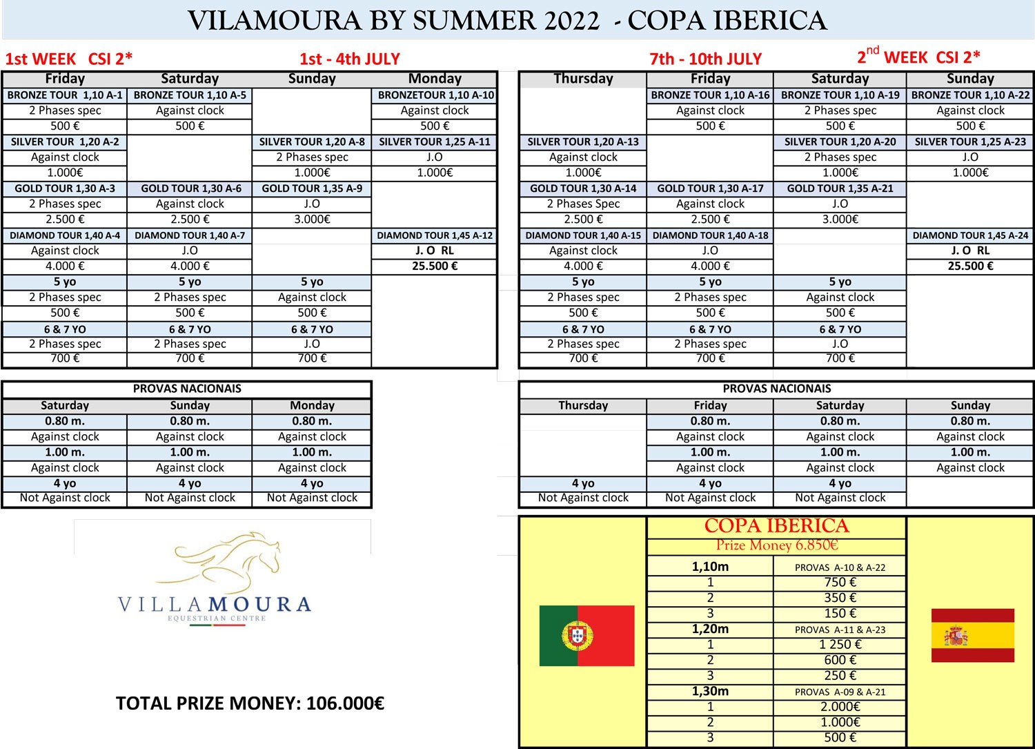 Do programa constam a Copa Ibérica, provas do Big Tour (1,40m), Medium Tour (1,30 e 1,20m) e Small Tour (1,10m) incluindo provas nacionais de 80cm e 1,00m assim como provas para cavalos de 4, 5, 6 e 7 anos.