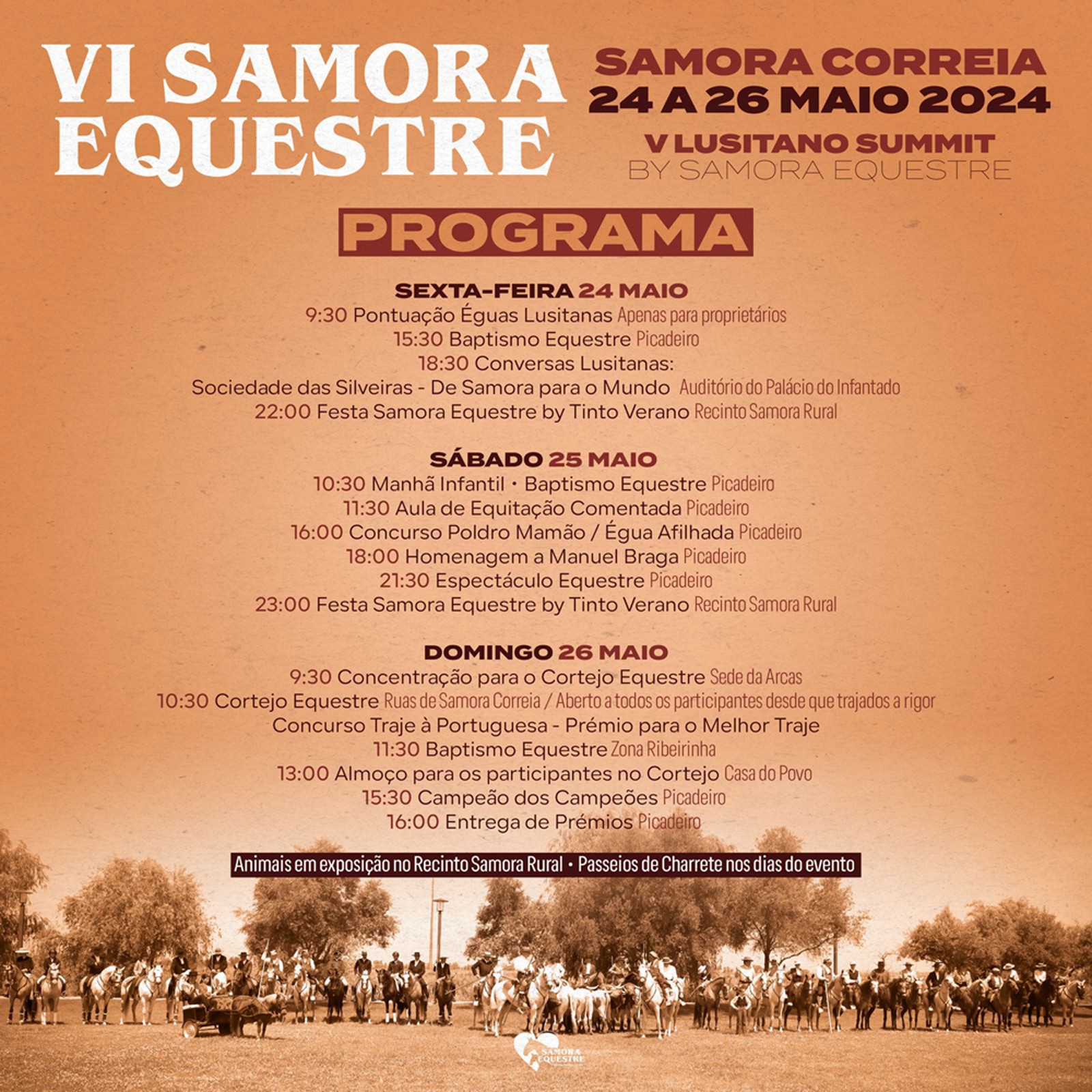 Após o sucesso das edições anteriores, a Junta de Freguesia de Samora Correia, em colaboração com alguns criadores locais, organiza a VI edição do Samora Equestre, que ocorrerá de 24 a 26 de maio.