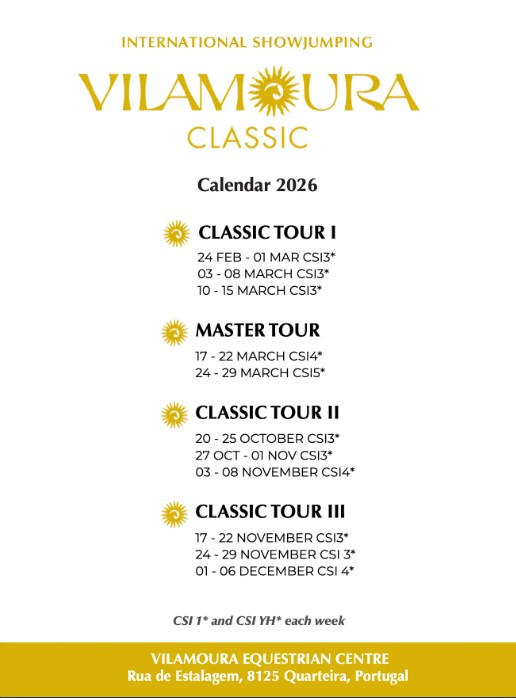A partir de 2026, a GRANDPRIX Events apresentará o Vilamoura Classic, um novo e ambicioso circuito internacional que marcará o calendário equestre europeu. Serão onze semanas de competição distribuídas ao longo de quatro grandes séries — Classic Tour I, Master Tour, Classic Tour II e Classic Tour III — consolidando Vilamoura como o principal destino de saltos de obstáculos de elite em Portugal.