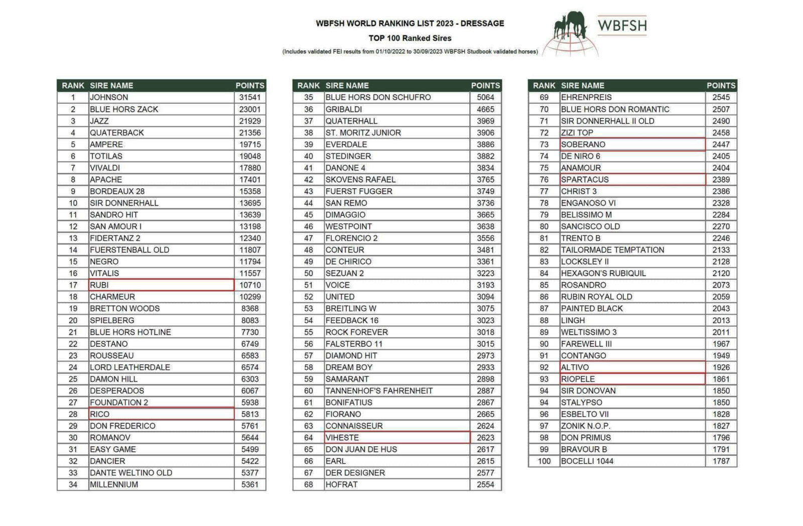 No Top 100 o garanhão KWPN «Johnson» (Jazz x Flemmingh), depois de oscilar entre o primeiro e o segundo lugar nos últimos quatro anos, confirmou a sua posição de liderança em 2023, com um impressionante total de 31.541 pontos. No segundo lugar, temos «Zack» (Rousseau x Jazz), também conhecido como «Blue Hors Zack», que subiu ao segundo lugar no ranking de reprodutores de Dressage de 2023, com 23.001 pontos.