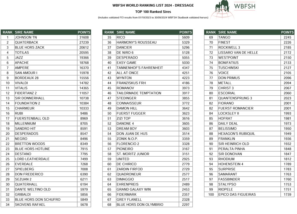 No topo do ranking de reprodutores de Dressage, pelo terceiro ano consecutivo, está «Johnson» (Jazz x Flemmingh). Com impressionantes 31.608 pontos, ele assegura o 1º lugar com ampla vantagem. Após cair para a quarta posição em 2023, vindo do segundo lugar em 2022, «Quaterback» (Quaterman x Brandenburger) regressa ao Top 3, ocupando a 2ª posição com 27.239 pontos.